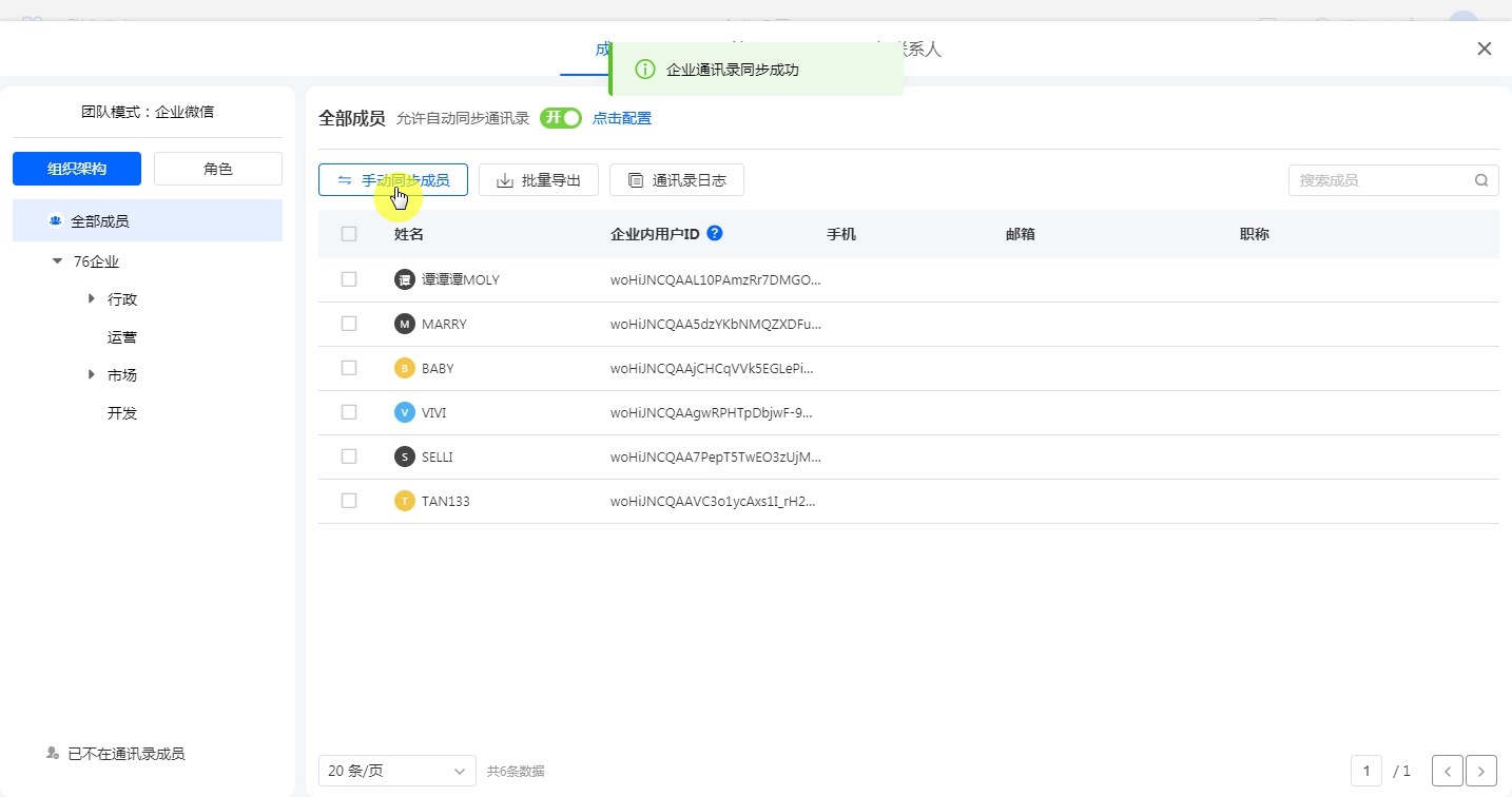 企业微信激活前3步完成后,就可以在系统汇中同步企业微信通讯录了,在系统通讯录中,点击[手动同步通讯录]即可同步。