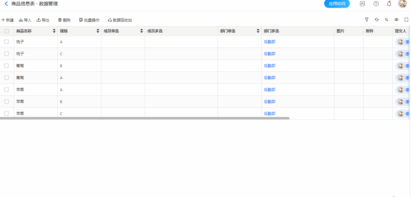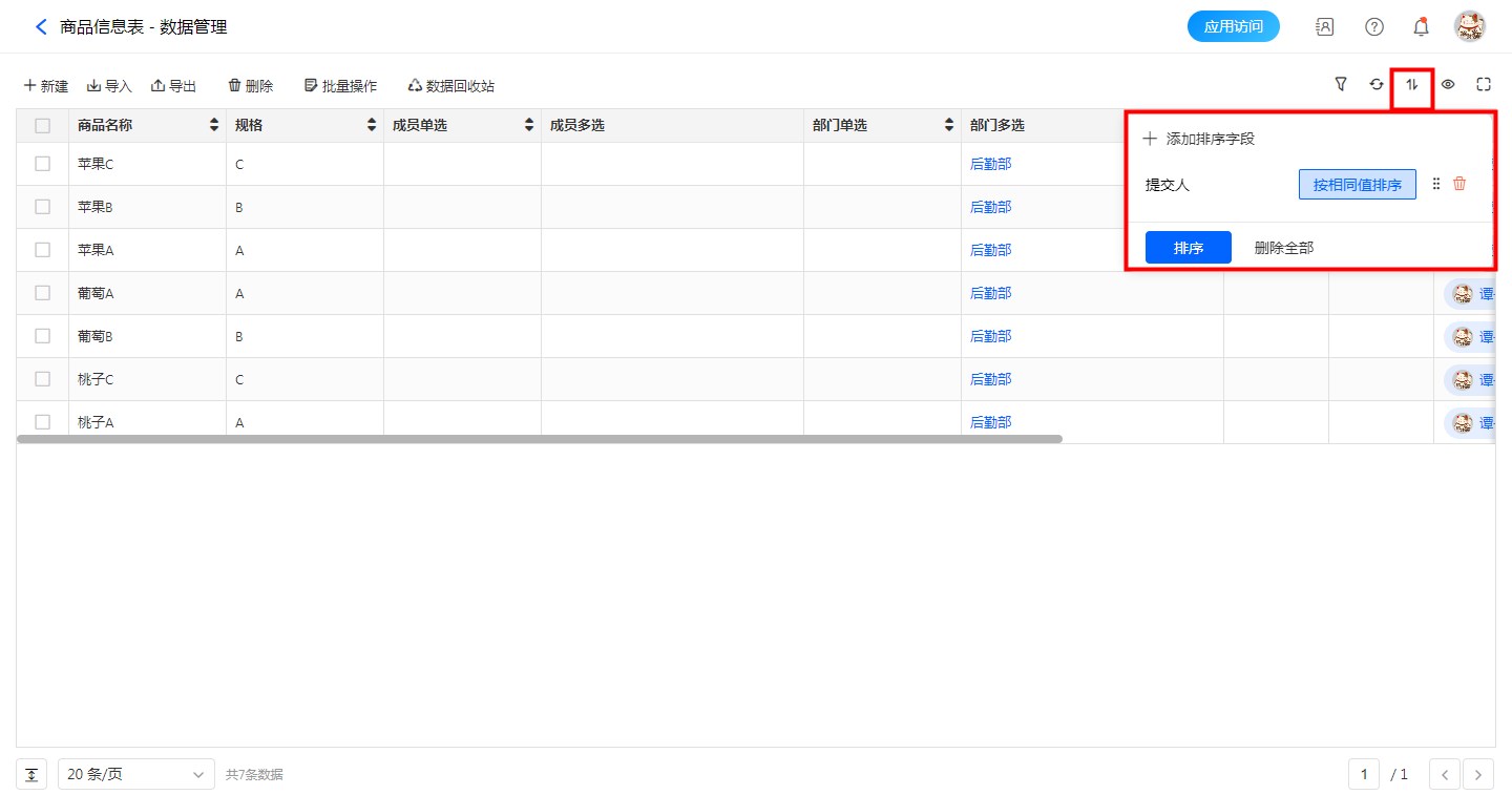 • 数据管理新增统一排序入口,排序字段新增 成员单选 部门单选 提交人 字段的排序规则