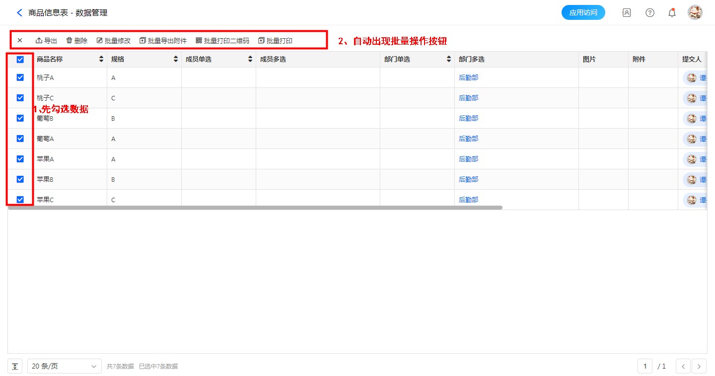 • 数据管理中,部分批量操作(如批量打印、批量调整负责人、批量结束流程),勾选数据后自动出现操作按钮