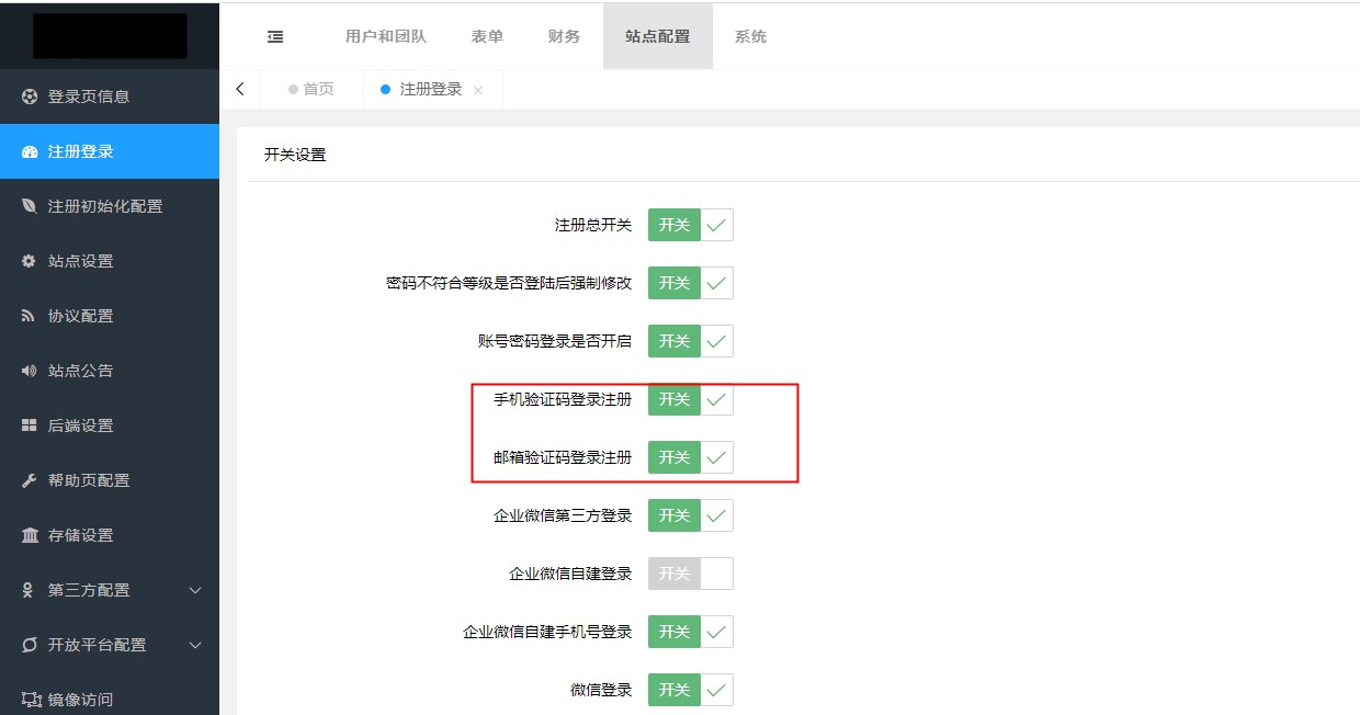 后台设置入口:站点设置—>注册登录下【手机验证码登录注册】、【邮箱验证码登录注册】