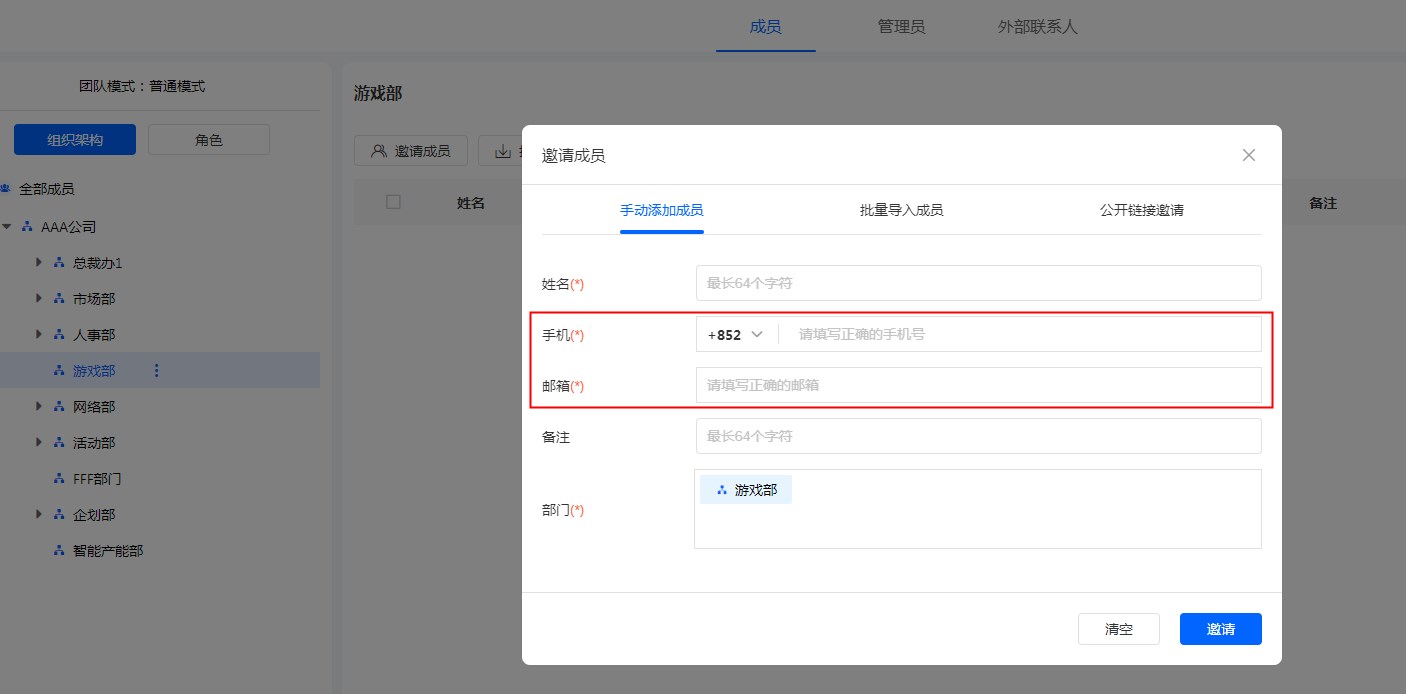 • 当【手机验证码登录注册】&【邮箱验证码登录注册】均开启时,管理员通讯录邀请成员时,手机或邮箱其中一项必填;此时若手机邮箱都填时邀请手机对应的账户;填手机或邮箱其中一项时,邀请填写方式对应的账户。