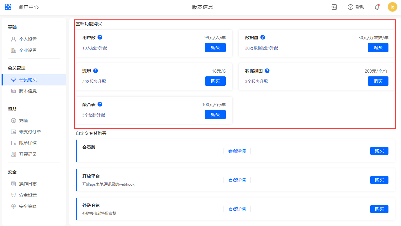 基础项购买:基础套餐购买总开关