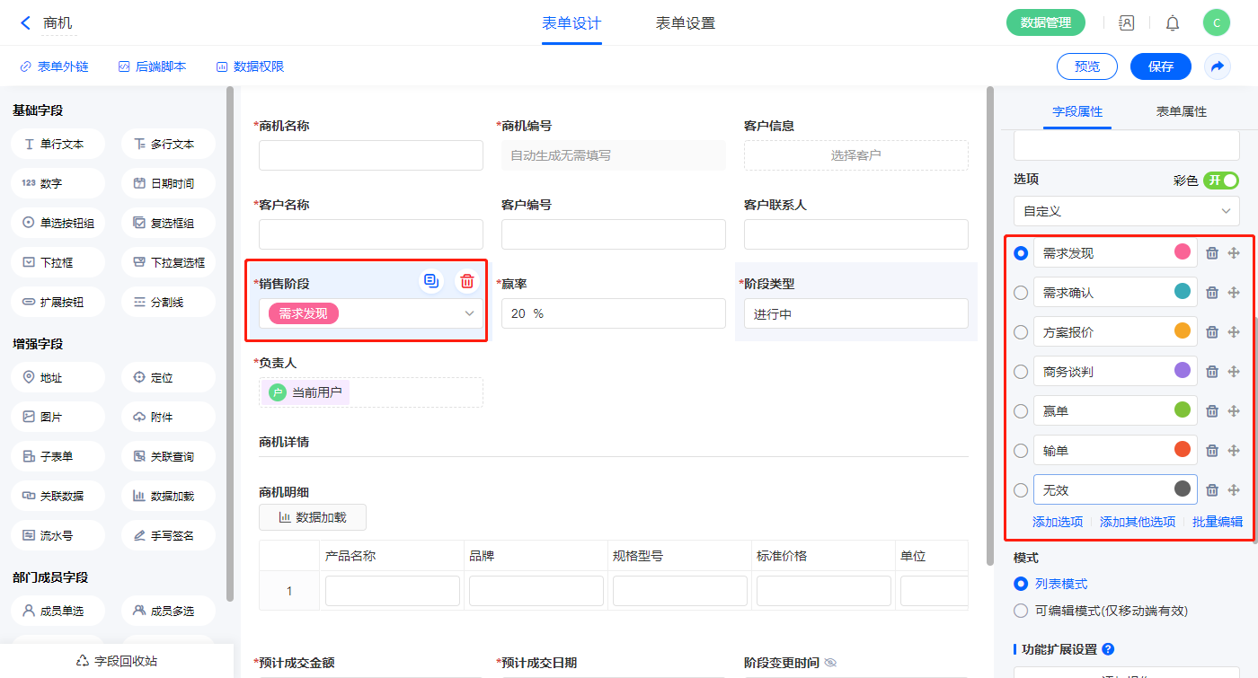 1)选中【销售阶段】字段,在选项中输入选项,并设置默认值为需求发现;;