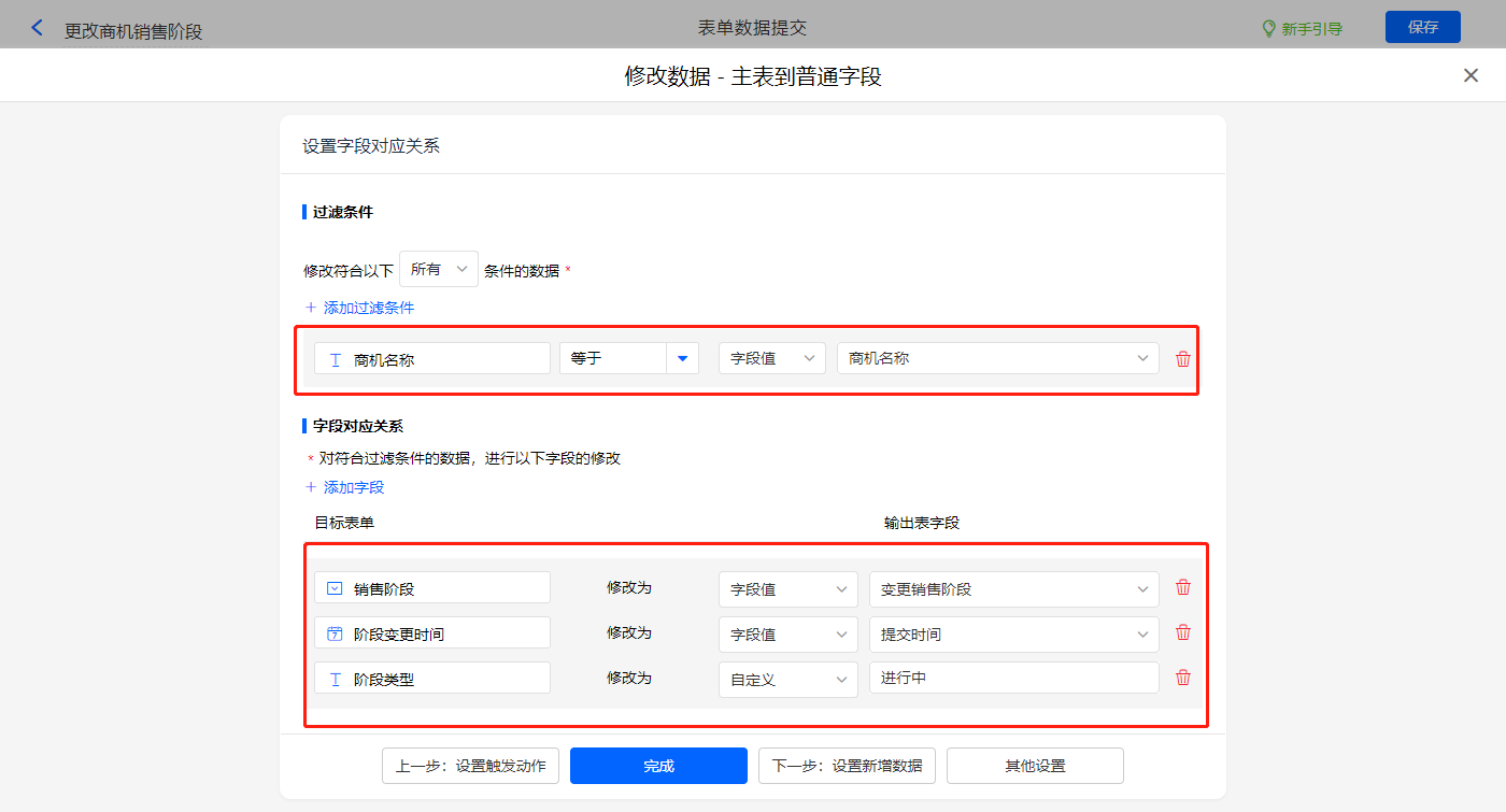 触发条件设置为当【变更销售阶段】字段不等于【赢单】,则修改主表【销售阶段】、【阶段变更时间】、【阶段类型】三个字段的值;