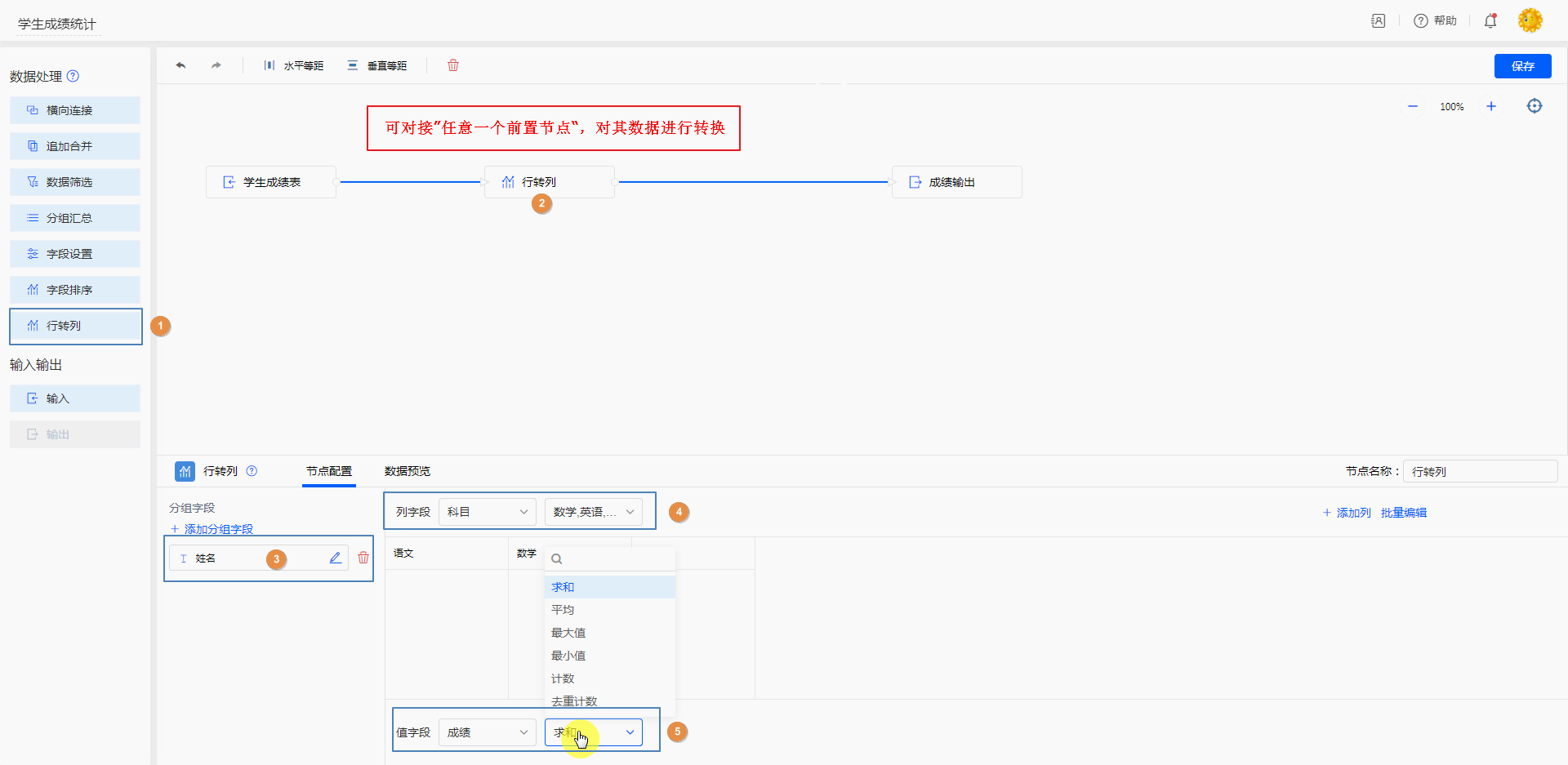 行转列:先根据设置的分组字段,把相同的值合并为一组;再根据设置的列字段、列和值字段,对分组后的数据进行计算并完成行数据到列表头的转换。实现一维表到二维表的转换。