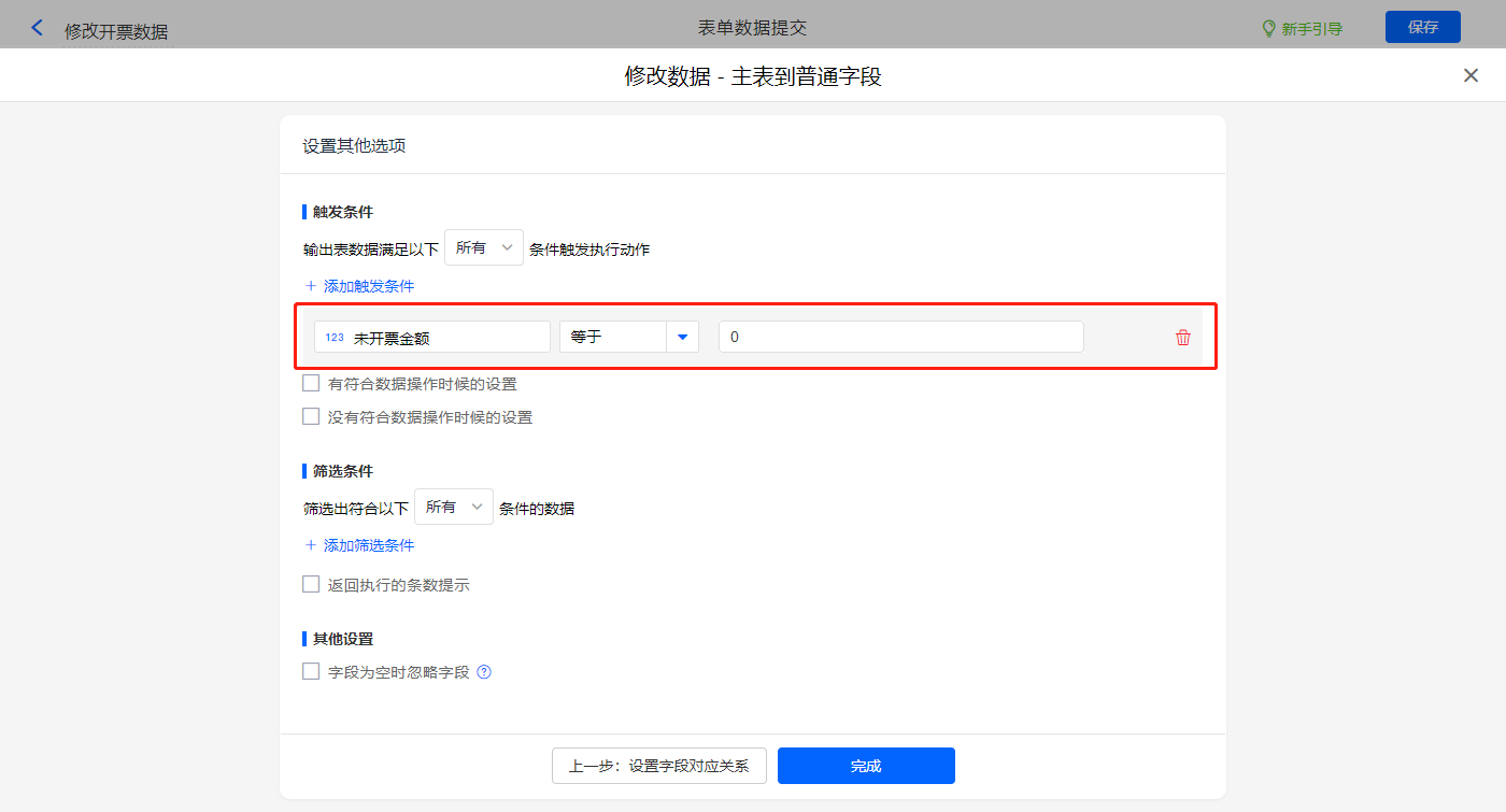 其他设置的触发条件为【未开票金额】等于0,设置好点击【完成】并保存该数据助手;