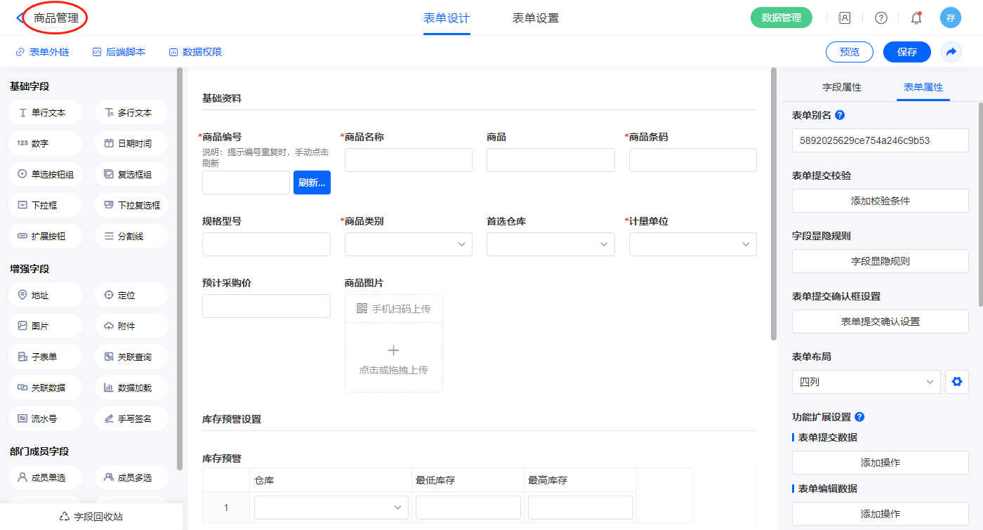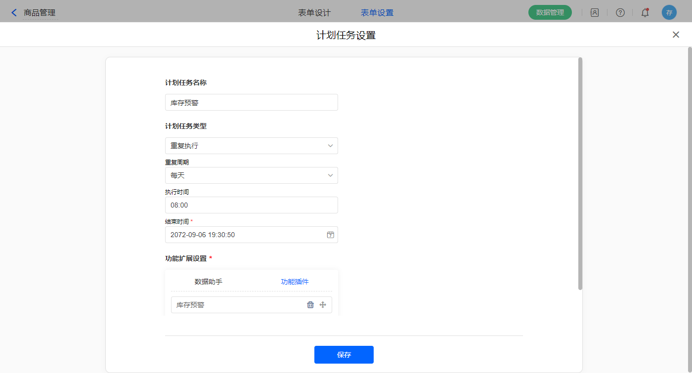 【库存预警】插件的设置如图所示,该插件设置涉及代码可进入应用详情查看;