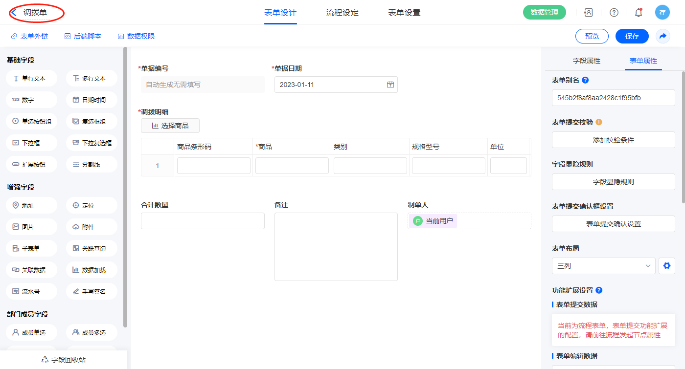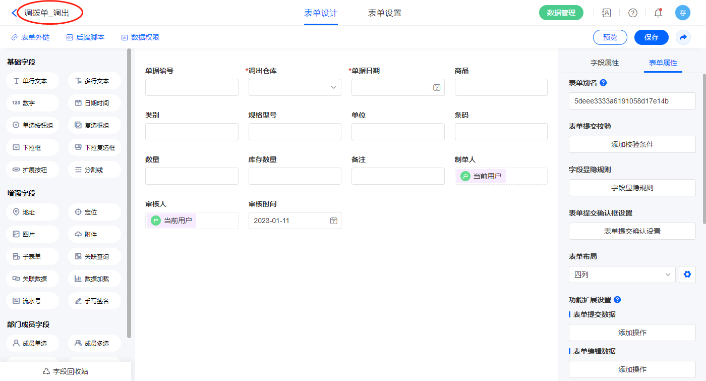 5)该表单是流程表单,设置流程节点审核,该节点属性的节点权限提交设置一条数据助手,名称为新增调出调入数据;