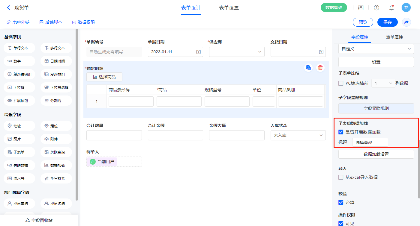 1)选中【调拨明细】字段,开启子表单数据加载;