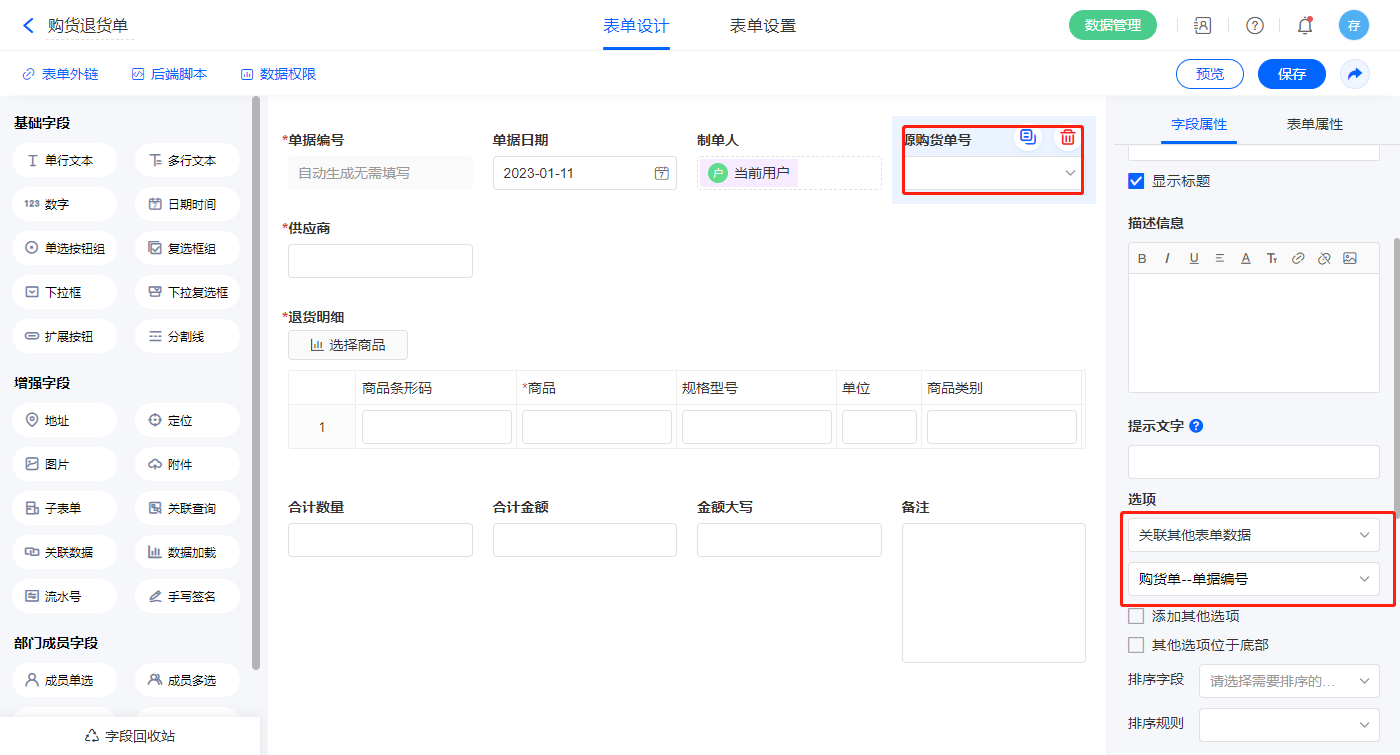 1)【源购货退货单号】字段,选择设置为关联其他表单数据,关联购货退货单的【单据编号】字段;