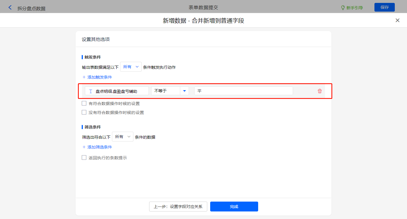 其他设置的触发条件为【盘点明细.盘盈盘亏辅助】不等于平,设置好点击【完成】并保存该数据助手;