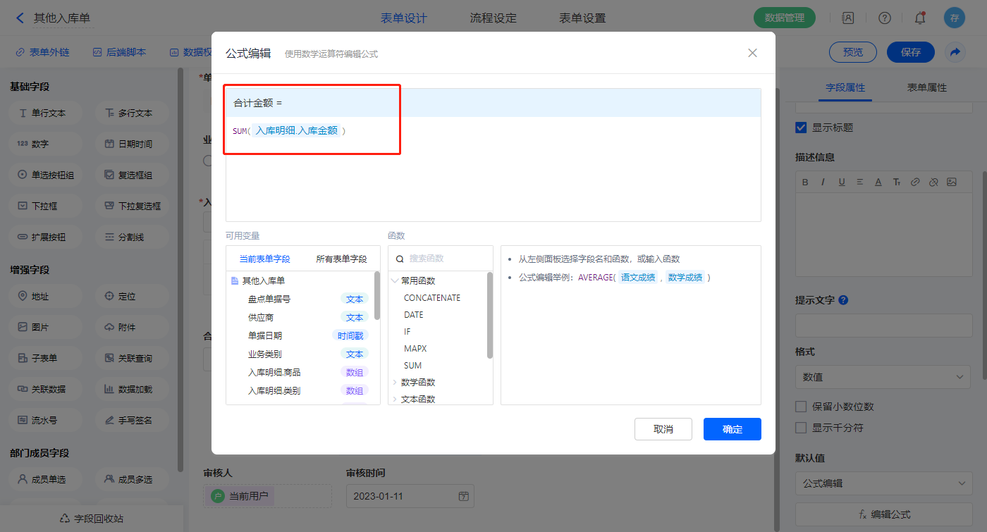 【合计金额】字段默认值设置为公式编辑,如图设置公式;