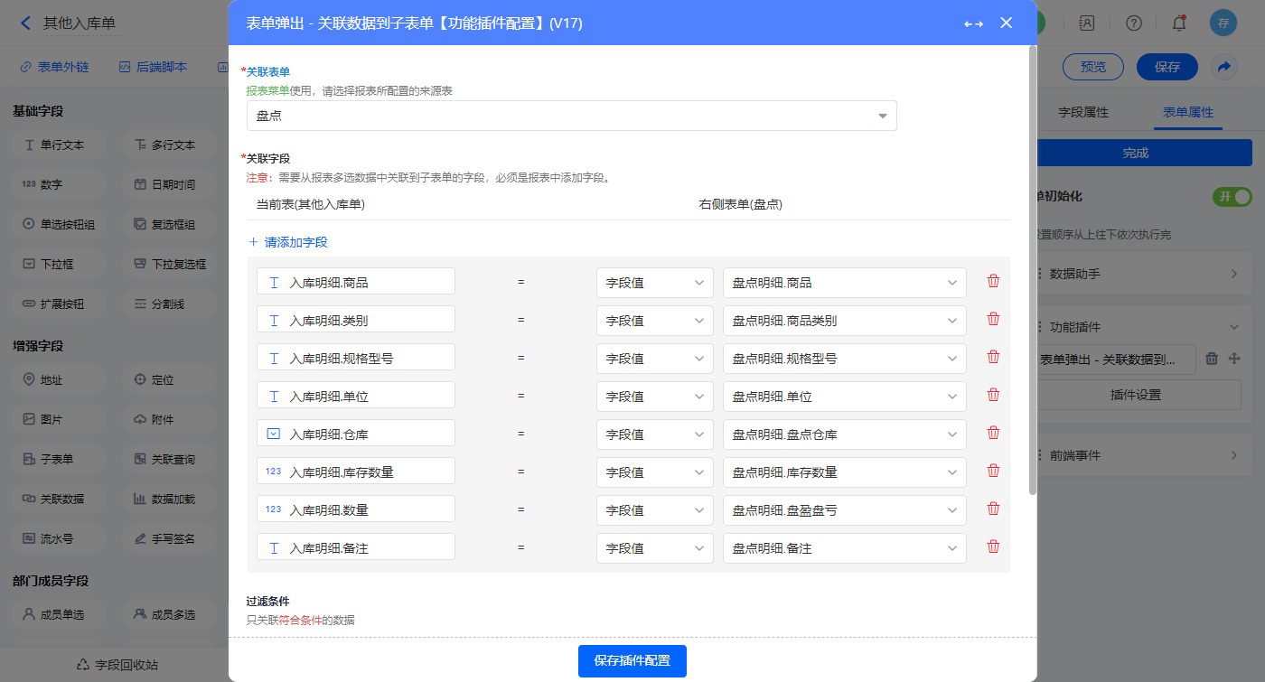选择关联表单为表单【盘点】,添加该表的子表单字段对应表单的字段,设置完成点击【保存模块设置】;