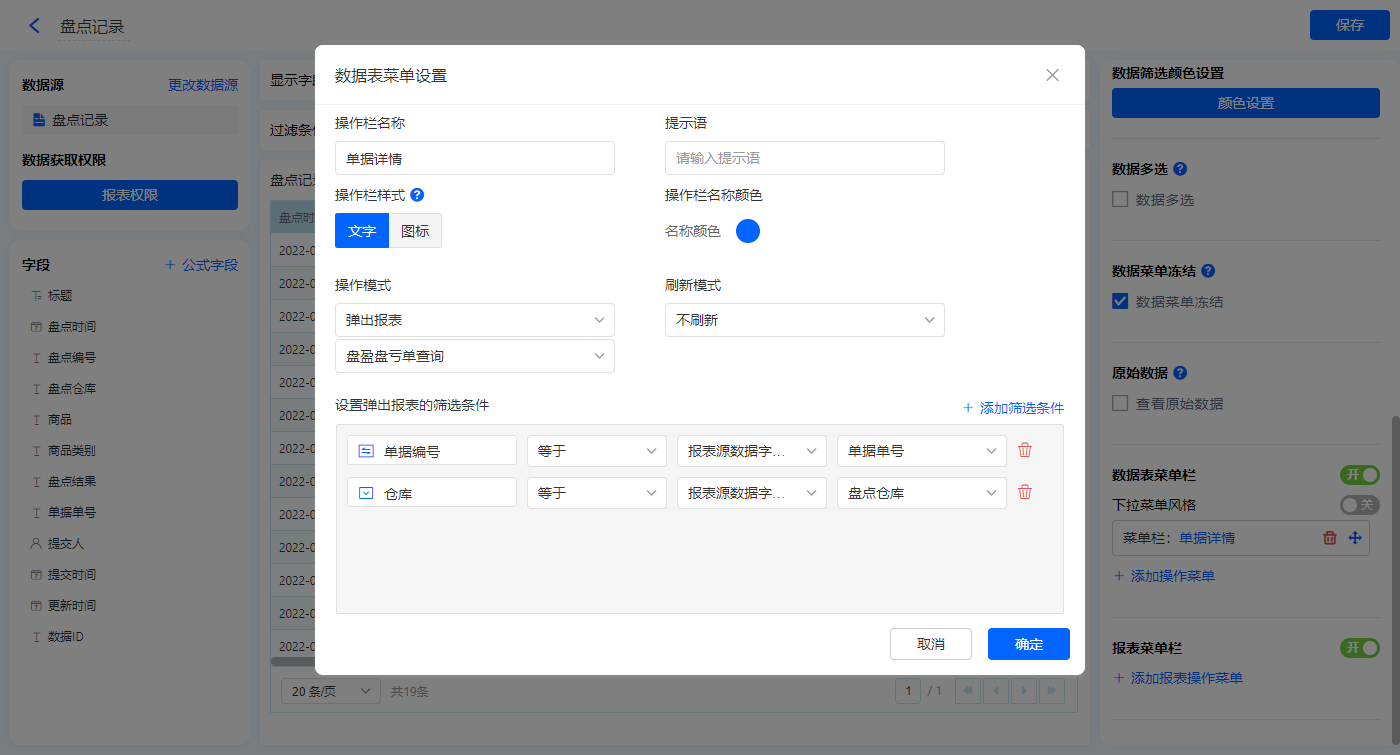 1)新增【盘点记录】报表,用基础报表【数据表】展示数据源为表单【盘点记录】的数据;