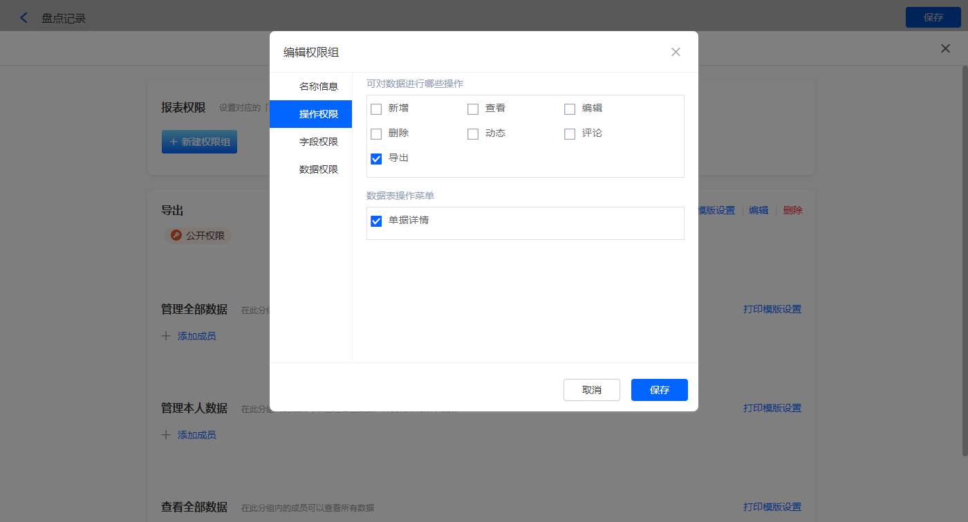 4)设置报表的权限,填入权限组名称,选择可操作的数据表菜单,点击【保存】;