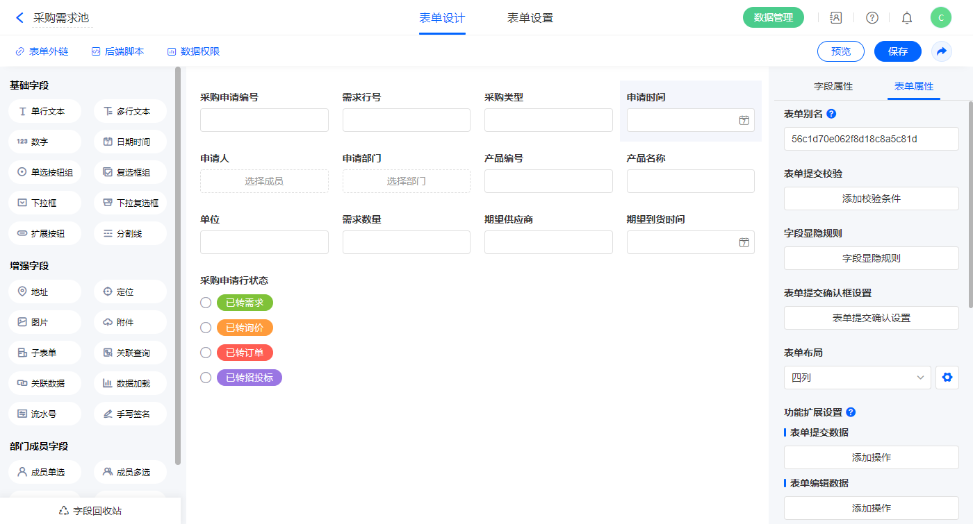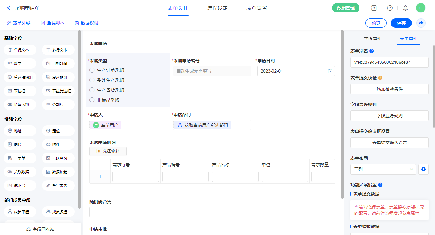 2.3、表单【采购申请单】字段及表单属性设置