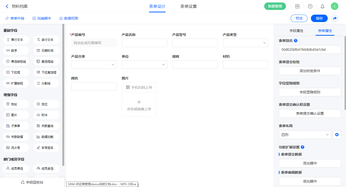 2.2、表单【供应商注册】字段及表单属性设置