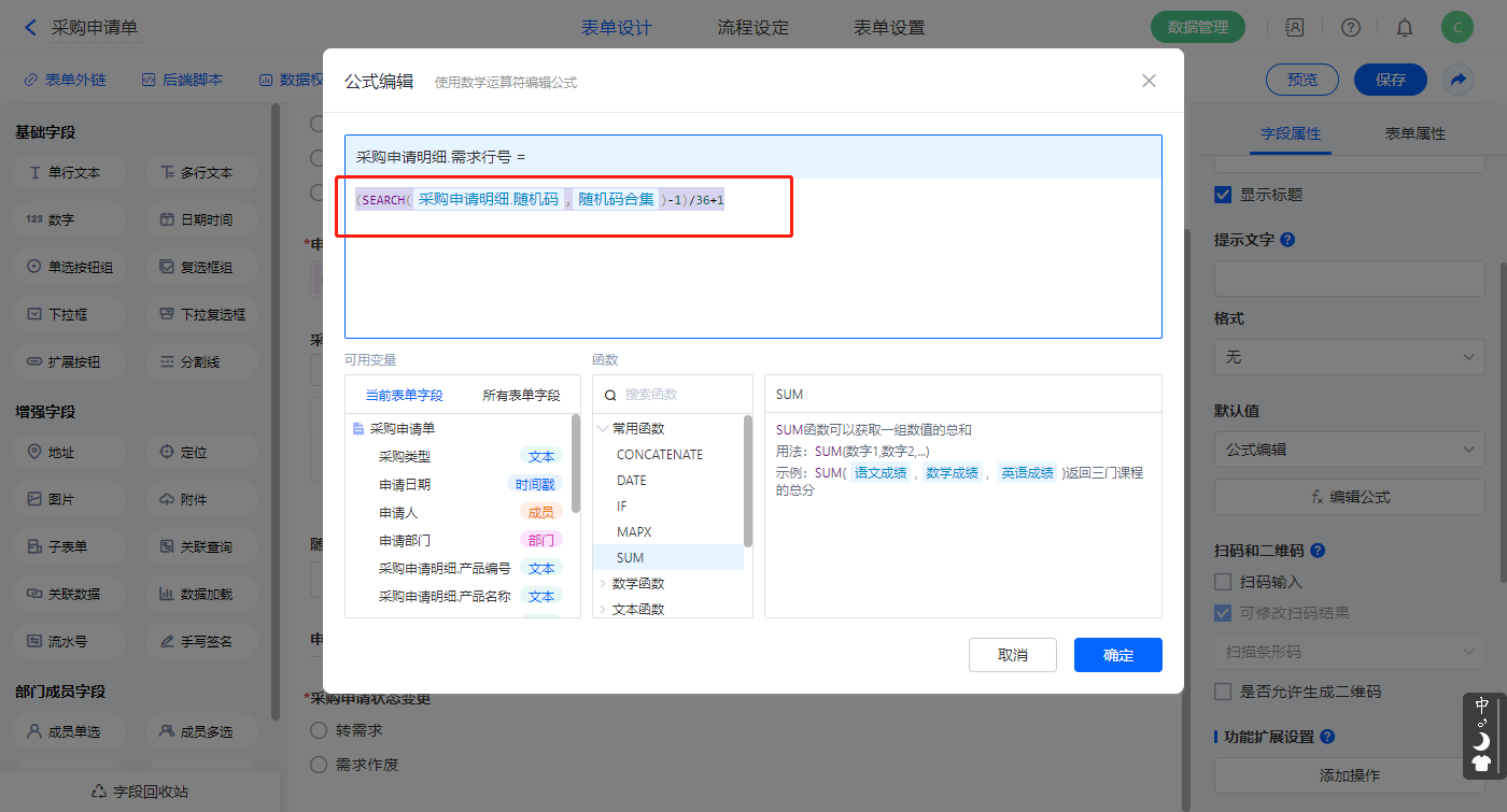 1)【采购申请明细.需求行号】字段,设置默认值为公式编辑,设置公式:“(SEARCH(采购申请明细.随机码,随机码合集)-1)/36+1”;