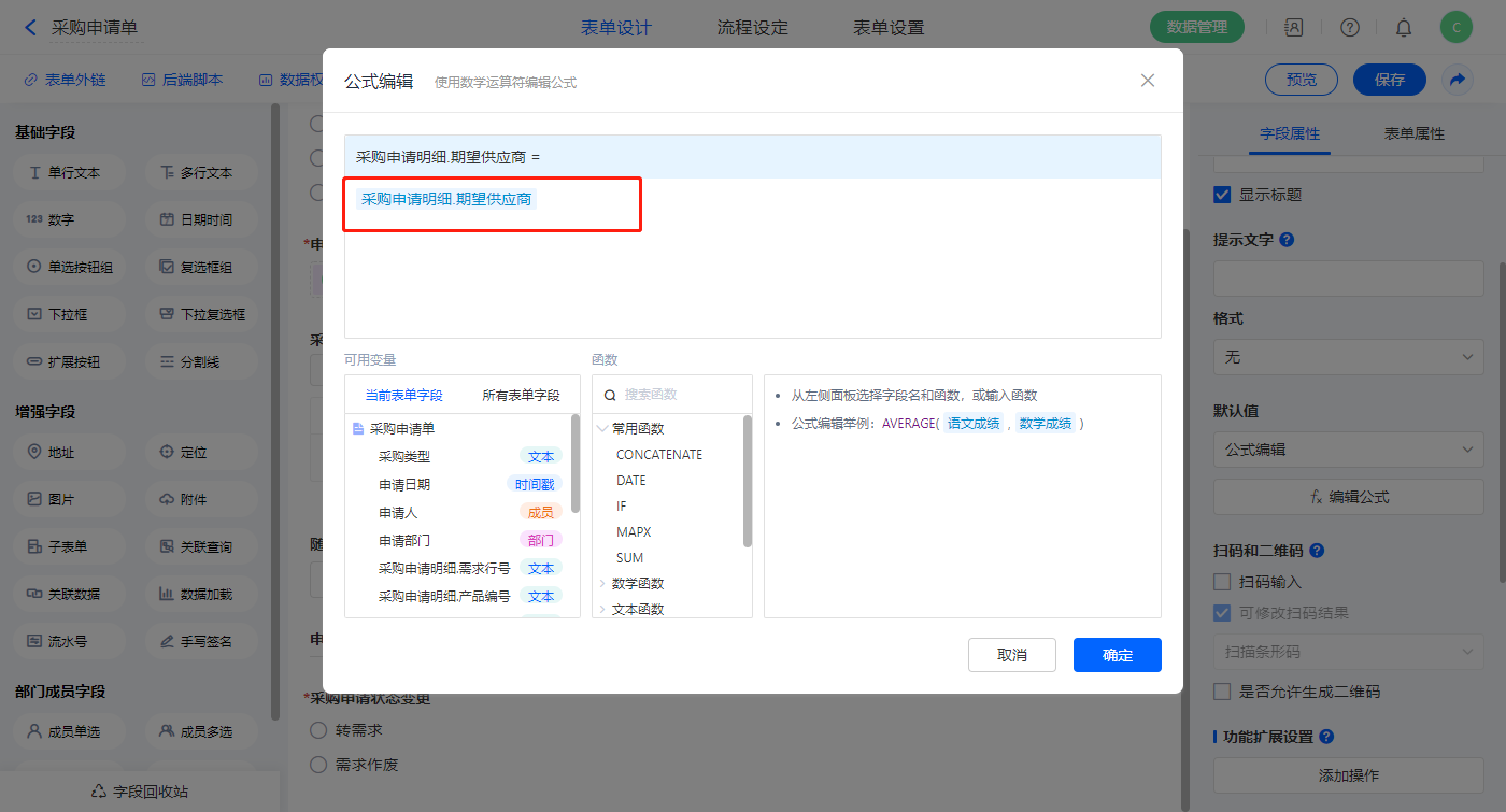 【采购申请明细.期望供应商】字段,设置默认值为公式编辑,如图设置公式;