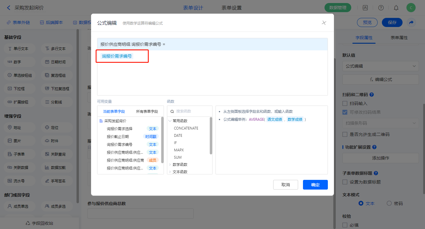 【报价供应商明细.询报价需求编号】字段,设置默认值为公式编辑,如图设置公式;