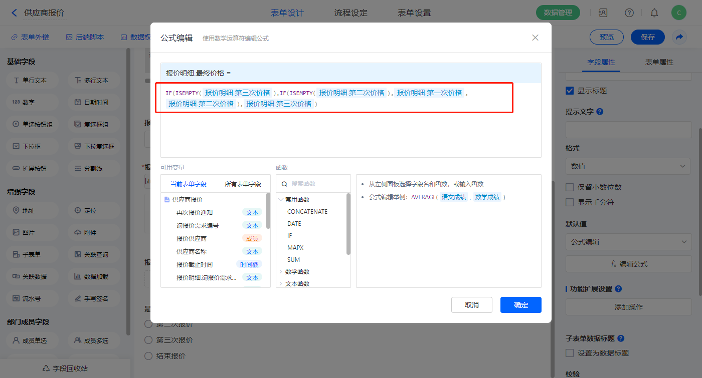 5)【报价明细.最终价格】字段,设置默认值为公式编辑,如图设置公式;