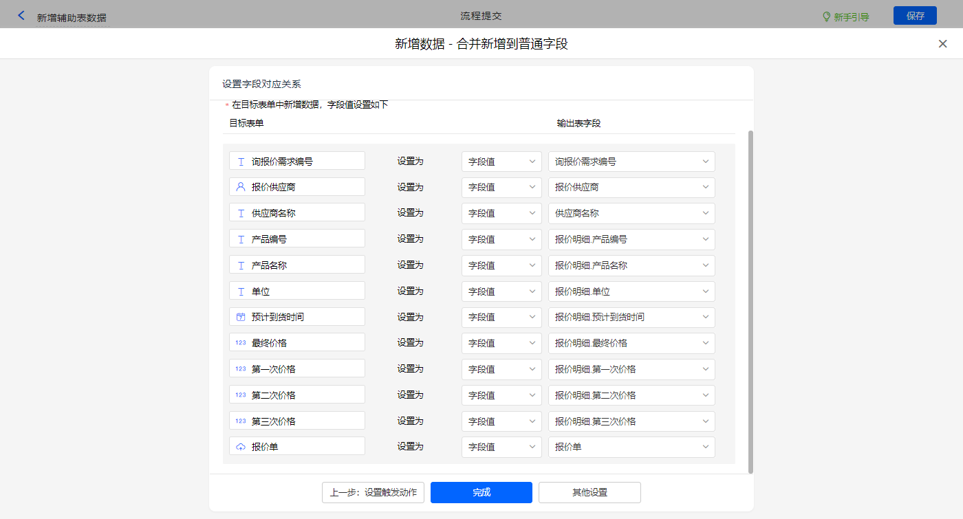 新增新增数据的执行动作,选择目标表单【供应商报价】,设置对应赋值字段,设置好点击【完成】并保存该数据助手;