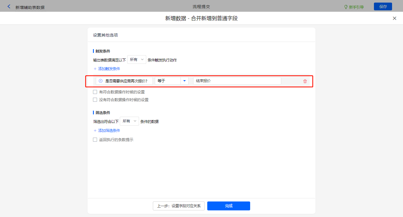 其他设置触发条件为【是否需要供应商再次报价?】字段等于结束报价,设置好点击【完成】并保存该数据助手;