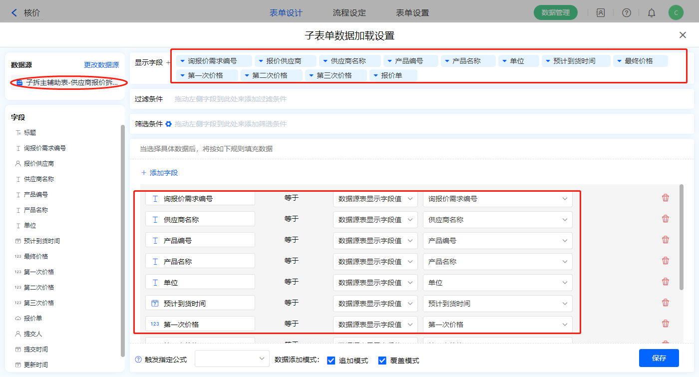 3)【最终价格上报】子表单字段,开启数据加载,数据源为【子拆主辅助表-供应商报价拆分】,添加显示字段设置好赋值字段,点击保存;