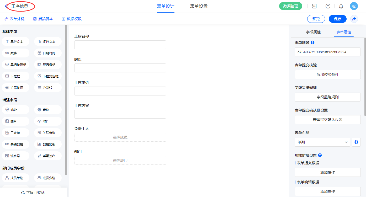 6)【工序详情.工序名称】字段,选择设置为关联其他表单数据,关联工序信息的【工序名称】字段;