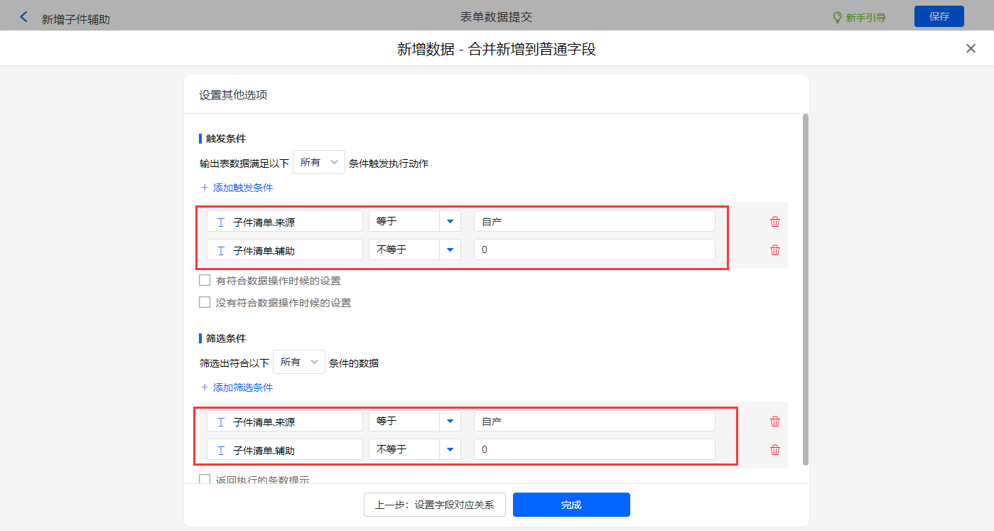 其他设置触发条件为【子件清单.来源】字段等于自产,【子件清单.辅助】字段不等于0,如上述同设置筛选条件,设置好点击【完成】并保存该数据助手;