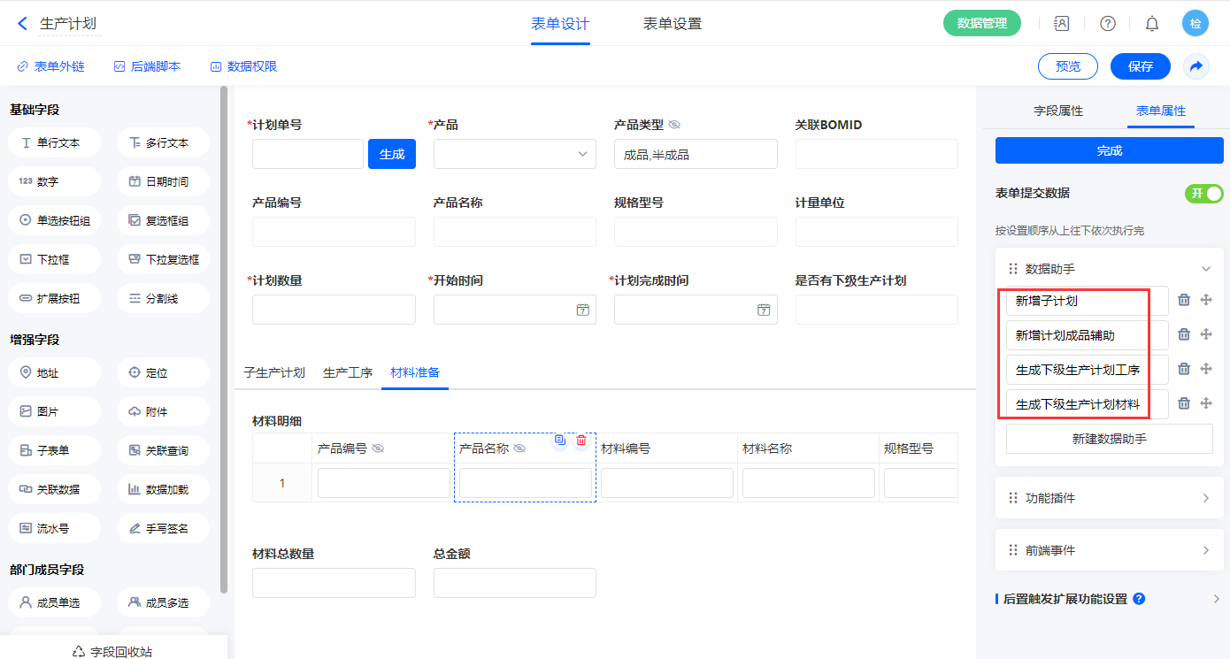 选择目标表单【计划成品辅助表】,设置对应赋值字段,设置好点击【完成】并保存该数据助手;