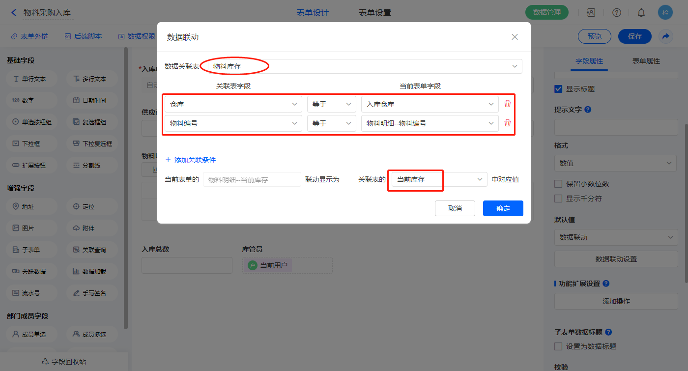 【物料明细.当前库存】字段,设置默认值为数据联动,设置联动条件及联动字段;