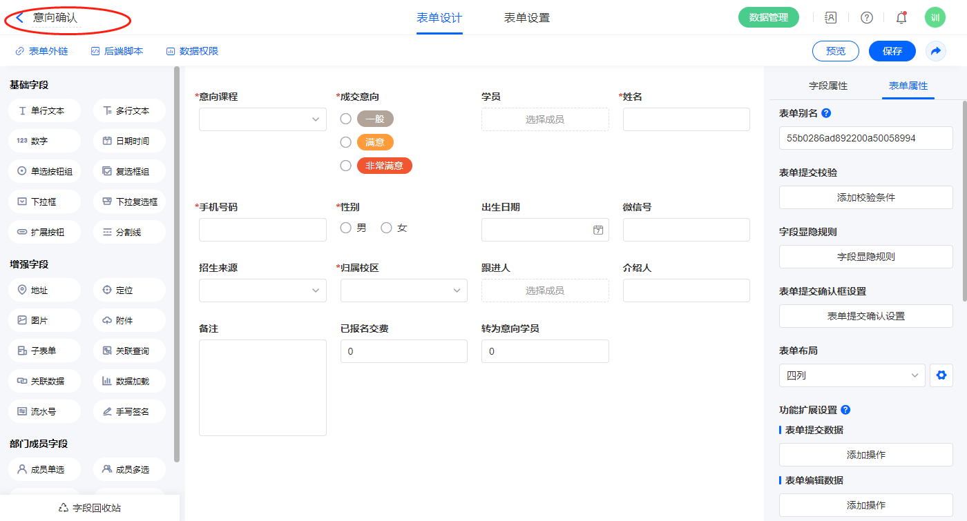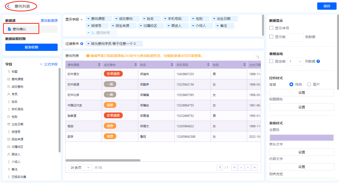 1)新增【意向学员】报表,用基础报表【数据表】展示数据源为表单【意向确认】的数据;