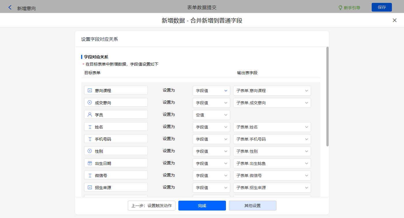 新增新增数据的执行动作,选择目标表单【意向确认】,选择对应赋值字段,置好点击【完成】并保存该数据助手;