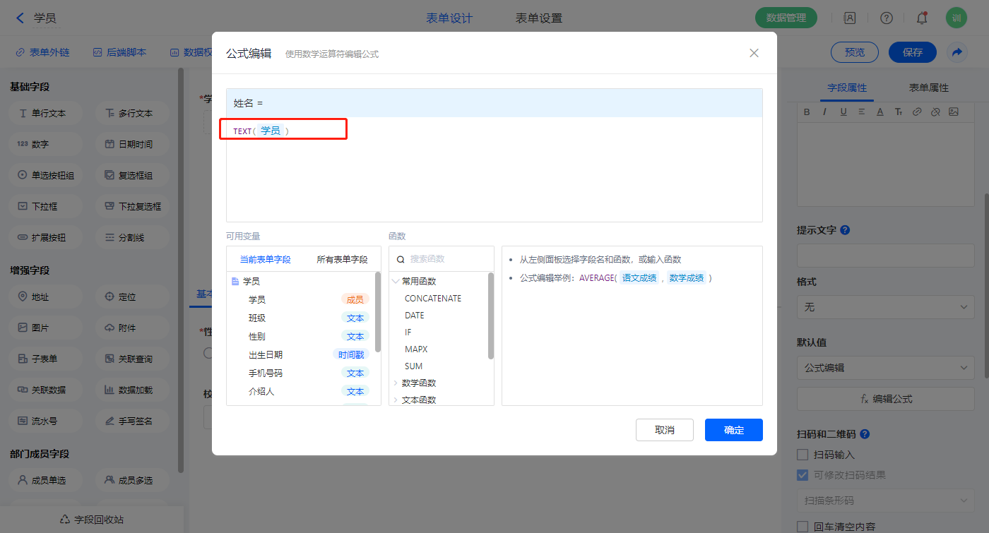 1)【姓名】字段,默认值选择公式编辑,如图设置公式,并设置操作权限为不可见;