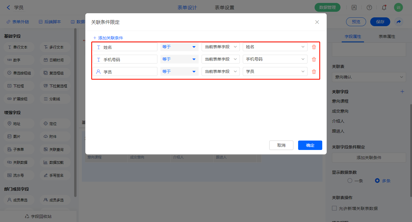设置关联条件,【姓名】、【手机号码】、【学员】字段作为关联条件;
