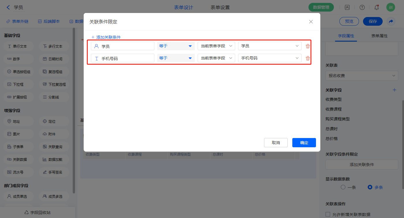 设置关联条件,【学员】、【手机号码】字段作为关联条件;