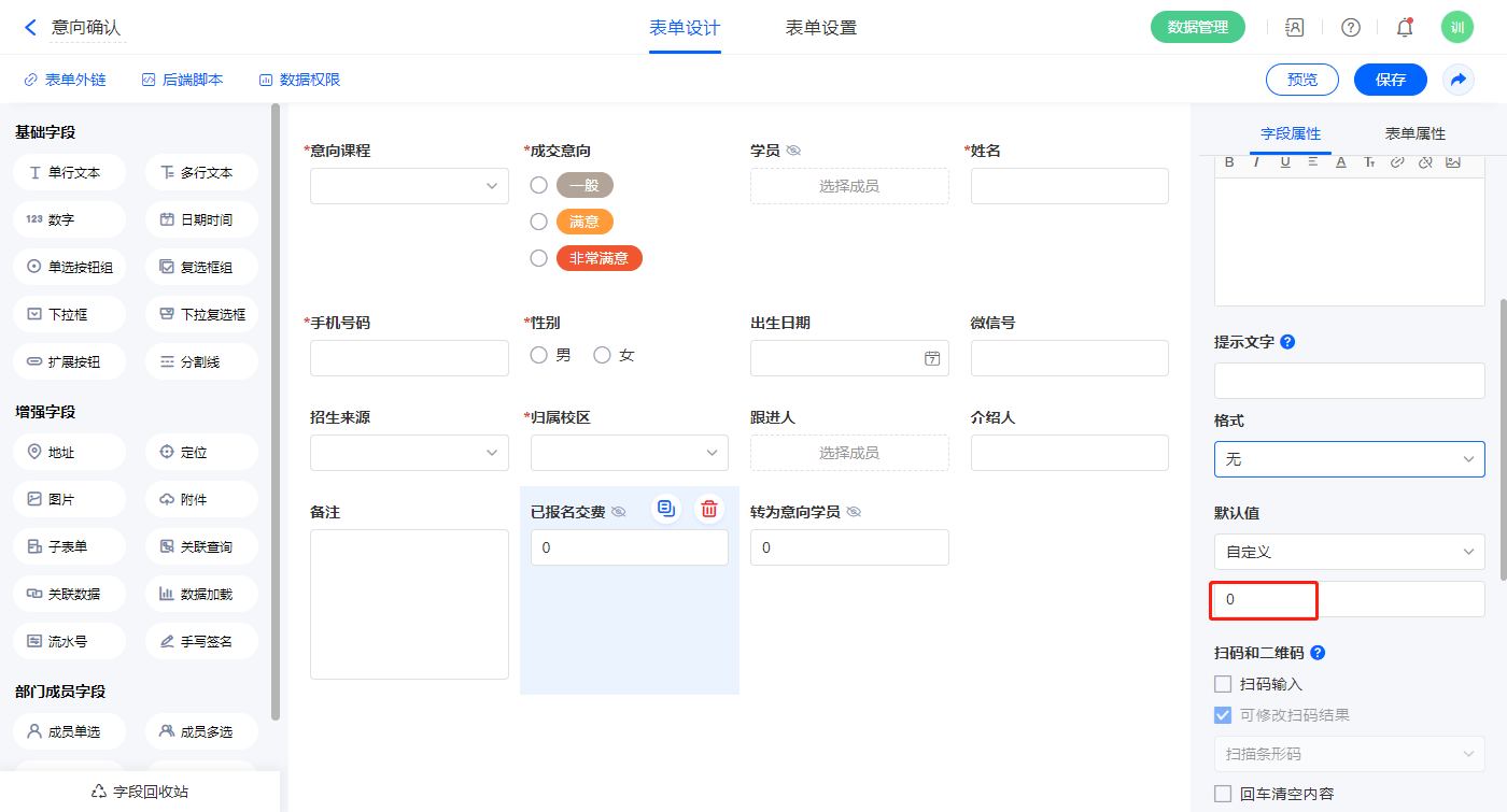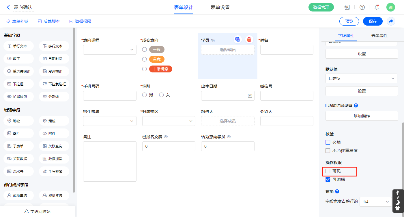 【已报名交费】、【转为意向学员】字段设置默认值为“0”,并设置操作权限为不可见;