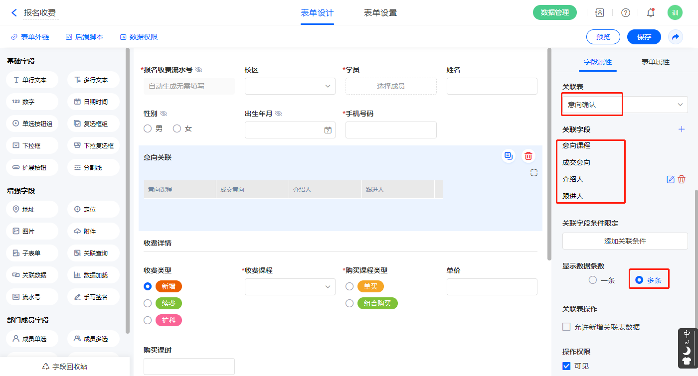 2)【意向关联】字段,设置关联表为【报名收费】并如图选择关联字段,设置显示数据条数为多条;