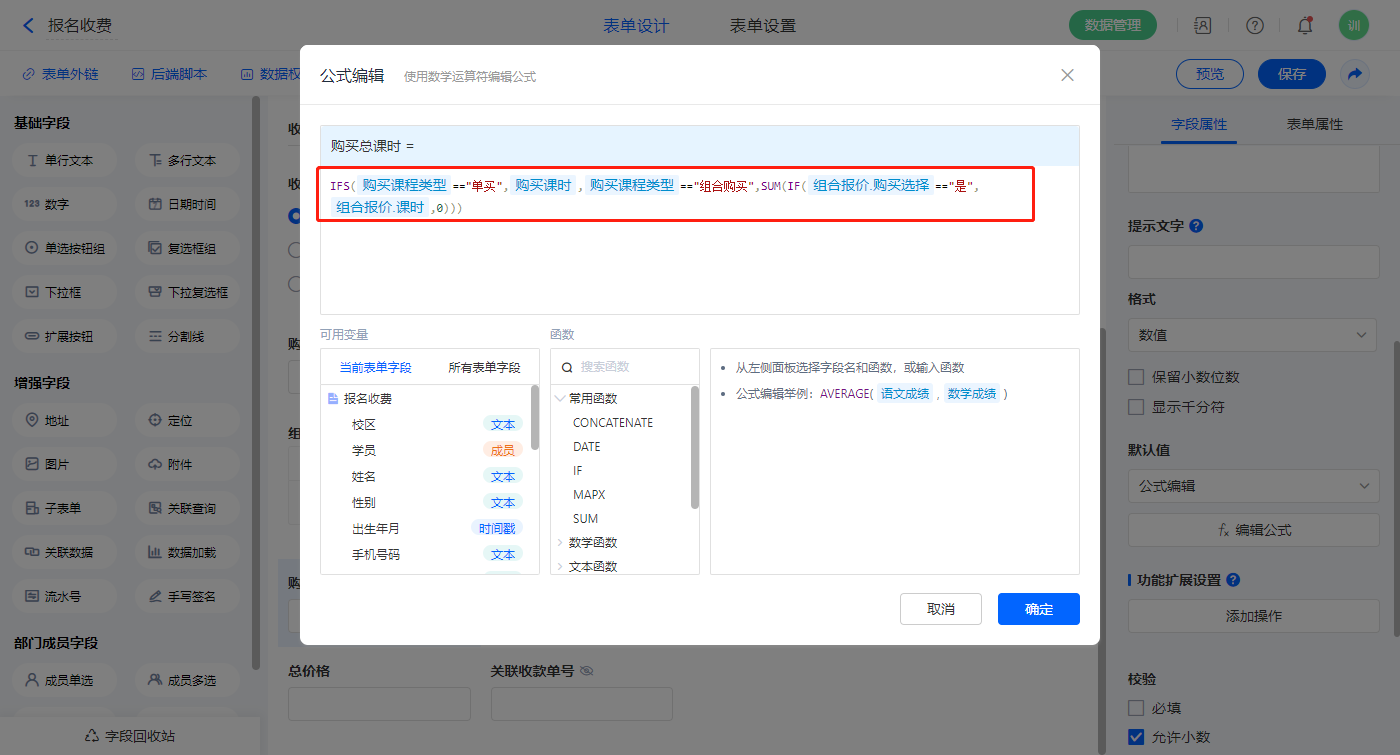 3)【购买总课时】字段,默认值选择公式编辑,如图设置公式;