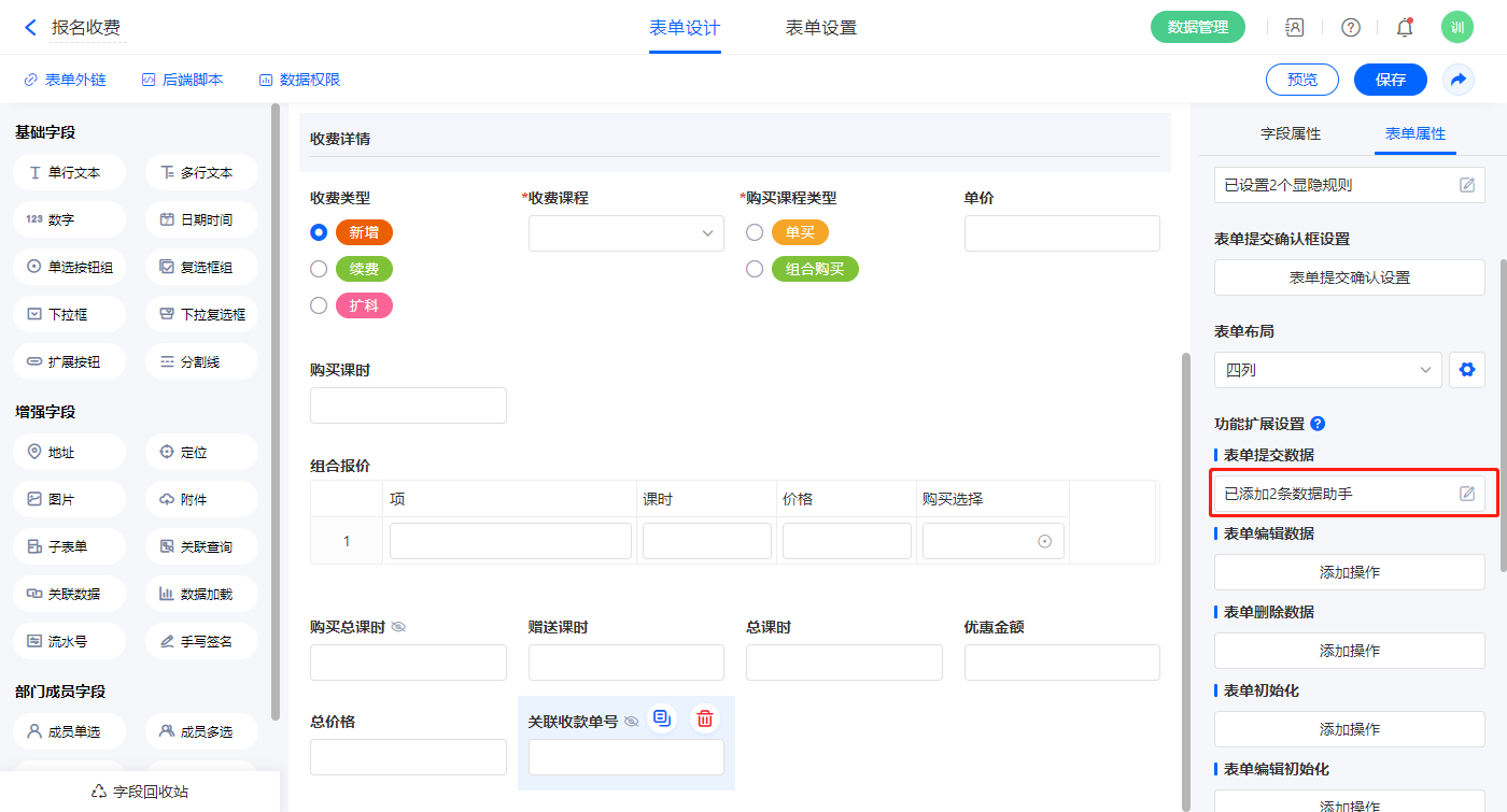 【课程】字段,设置关联表为【报名收费】并如图选择关联字段,设置显示数据条数为多条;