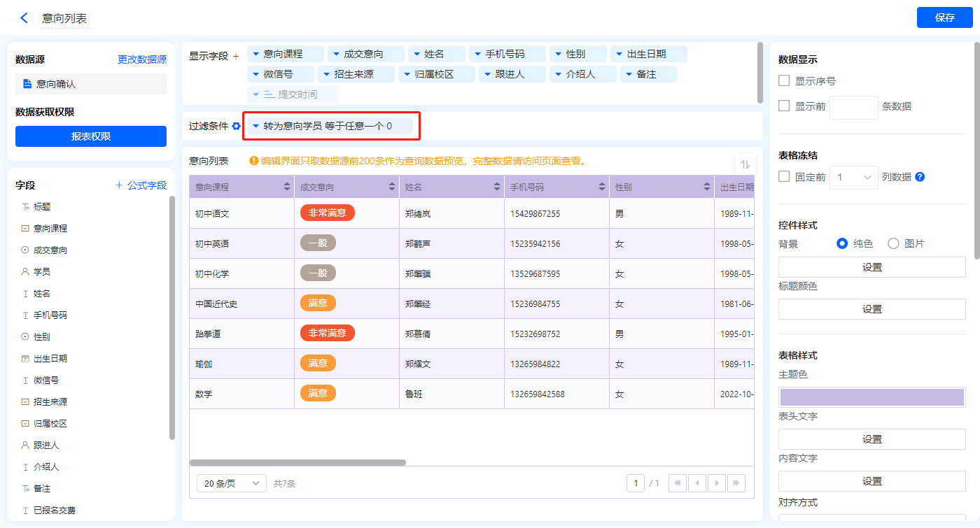 添加过滤条件,【转为意向学员】字段等于“1”;