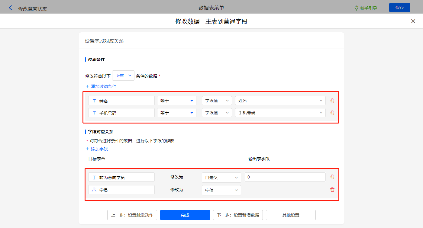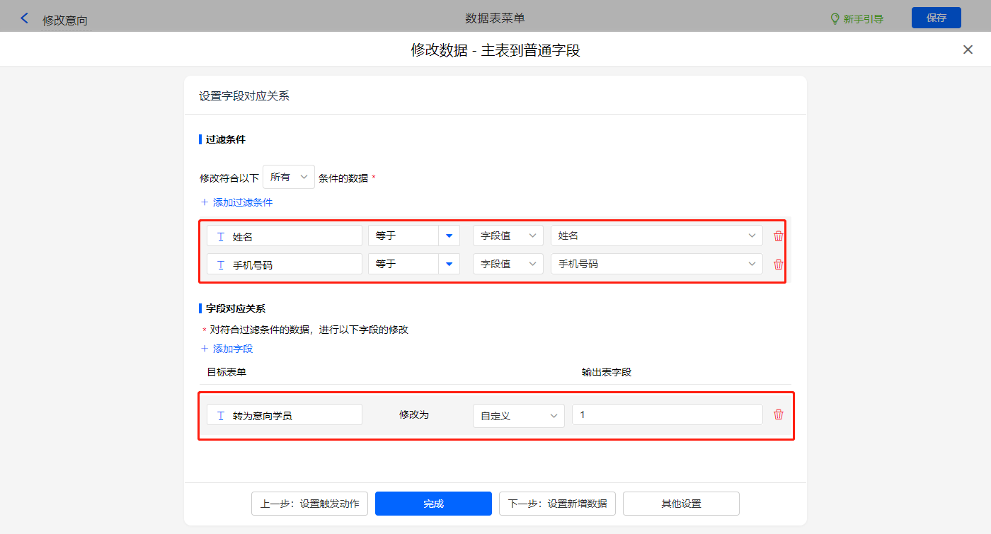 新增修改数据的执行动作,选择目标表单【意向确认】,添加过滤条件及对应修改字段,设置好点击【完成】并保存该数据助手;