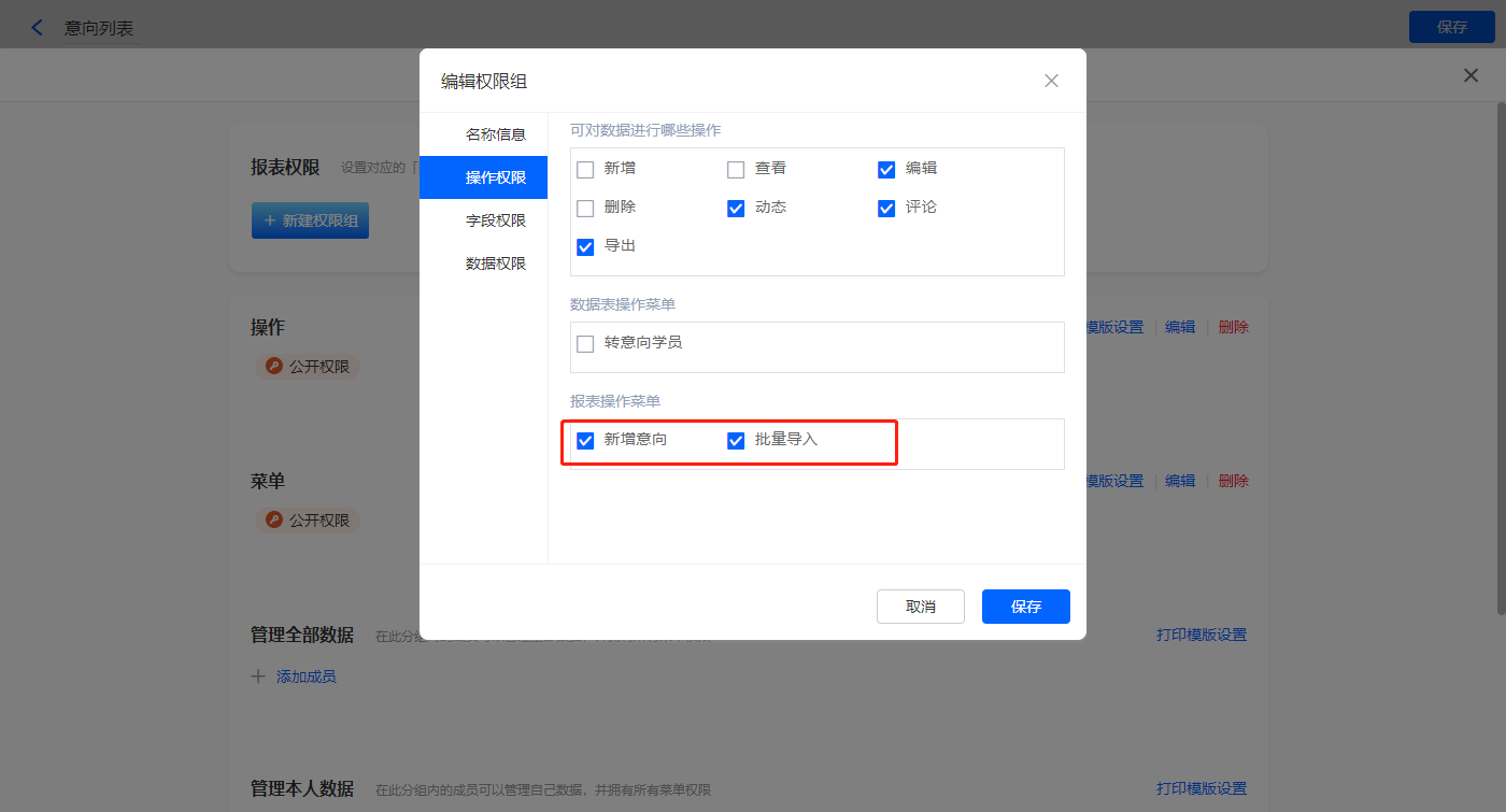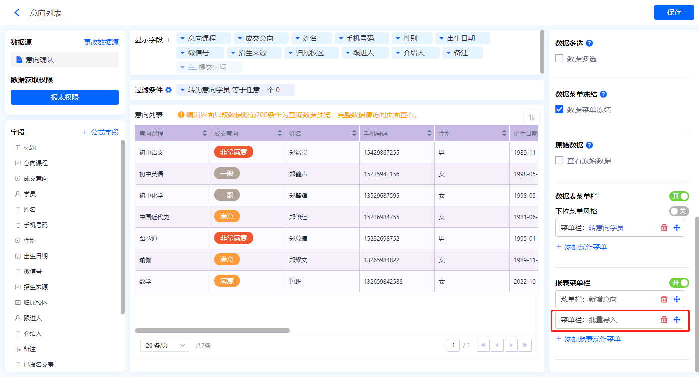 【批量导入】的报表菜单,操作模式设置为弹出表单【意向批量导入】;