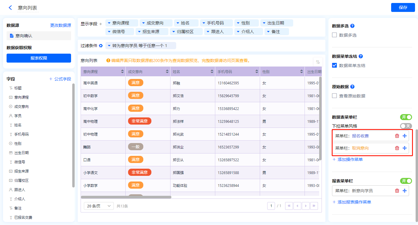 【转为意向学员】的菜单栏,操作模式设置为数据助手;