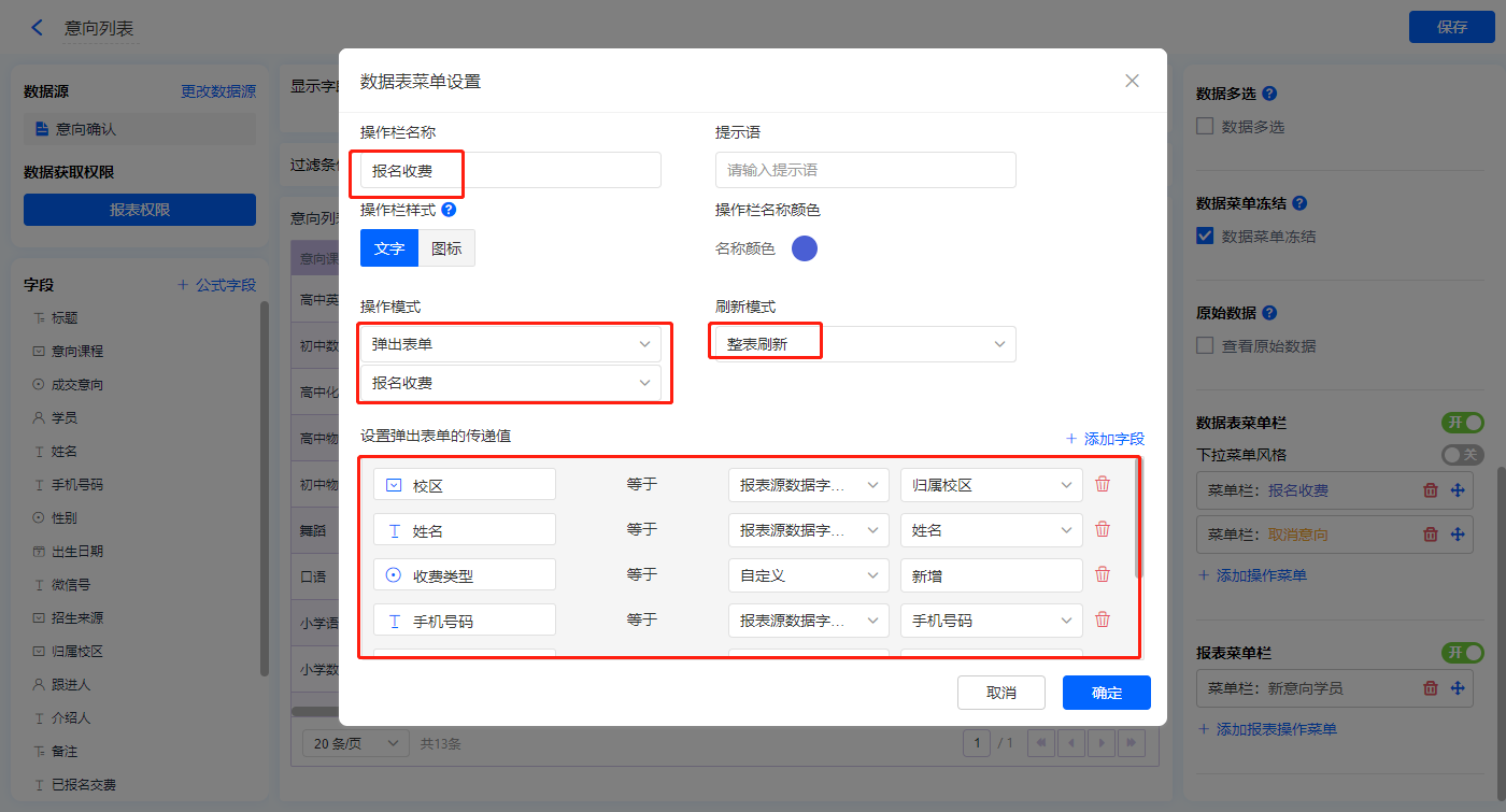 【报名收费】的菜单栏,操作模式设置为弹出表单【报名收费】;