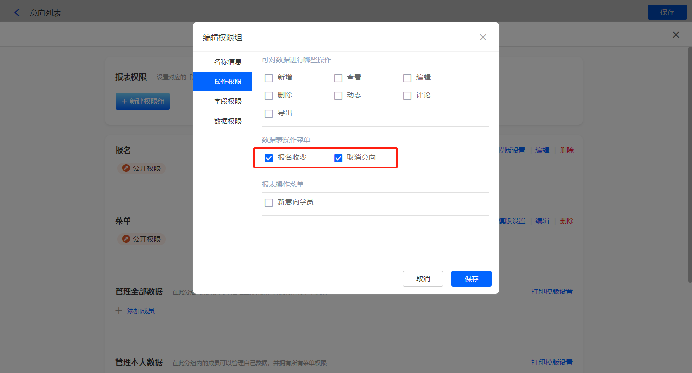 2)新增数据表菜单栏,【报名收费】、【取消意向】;