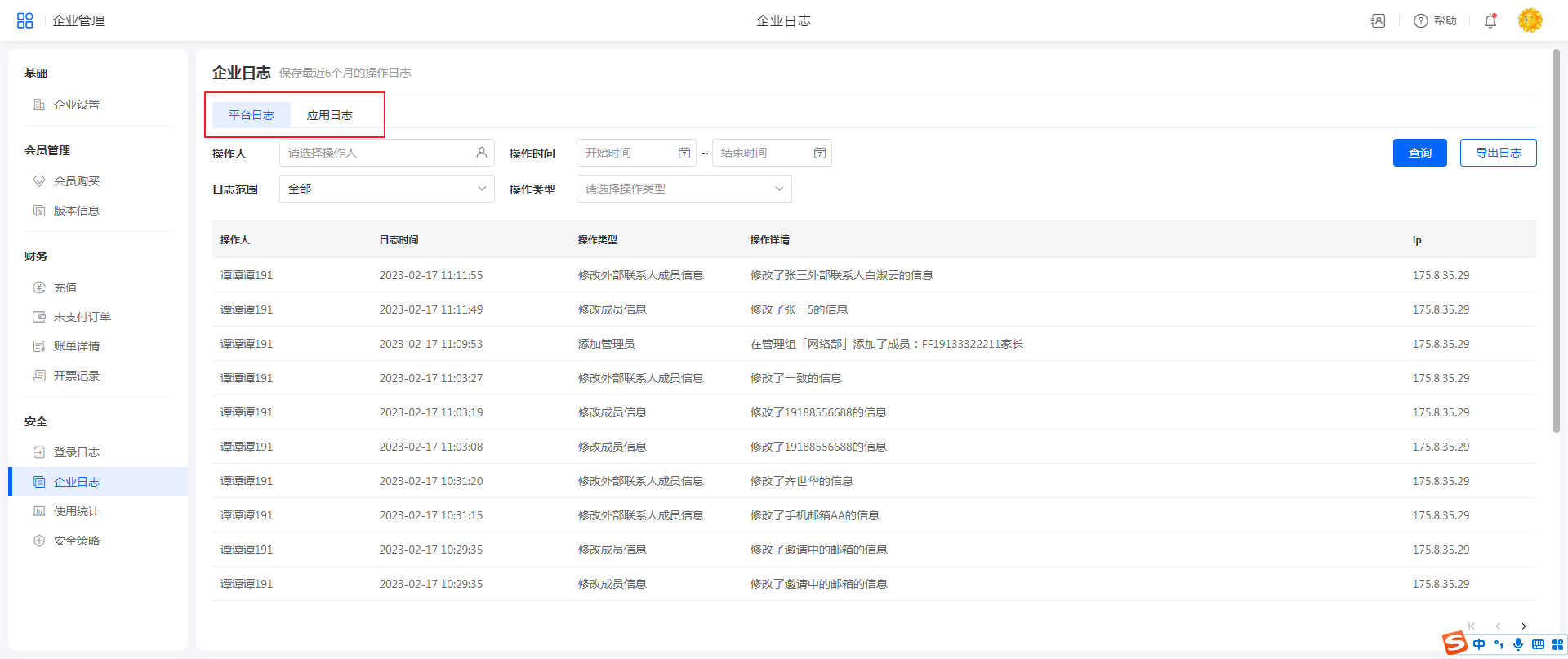 点击头像>> 企业管理 >> 企业日志,选择 [平台日志] 或 [应用日志] 。