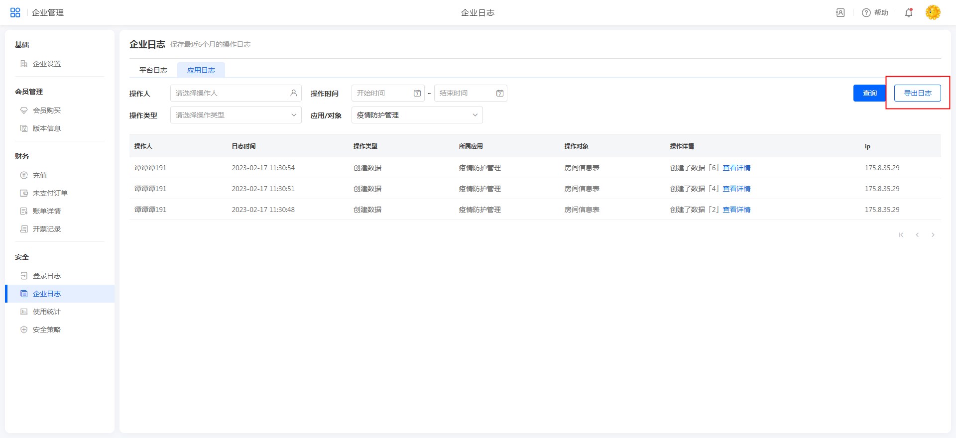 - 应用日志:平台应用内操作的日志,包含应用、表单/报表、数据视图、聚合表等模块的操作日志。