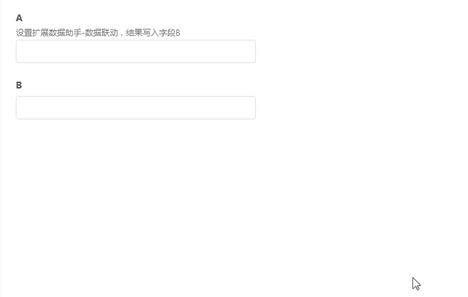 示例:A字段设置扩展(数据助手-数据联动),联动结果写入字段B,手动输入A字段值触发扩展。